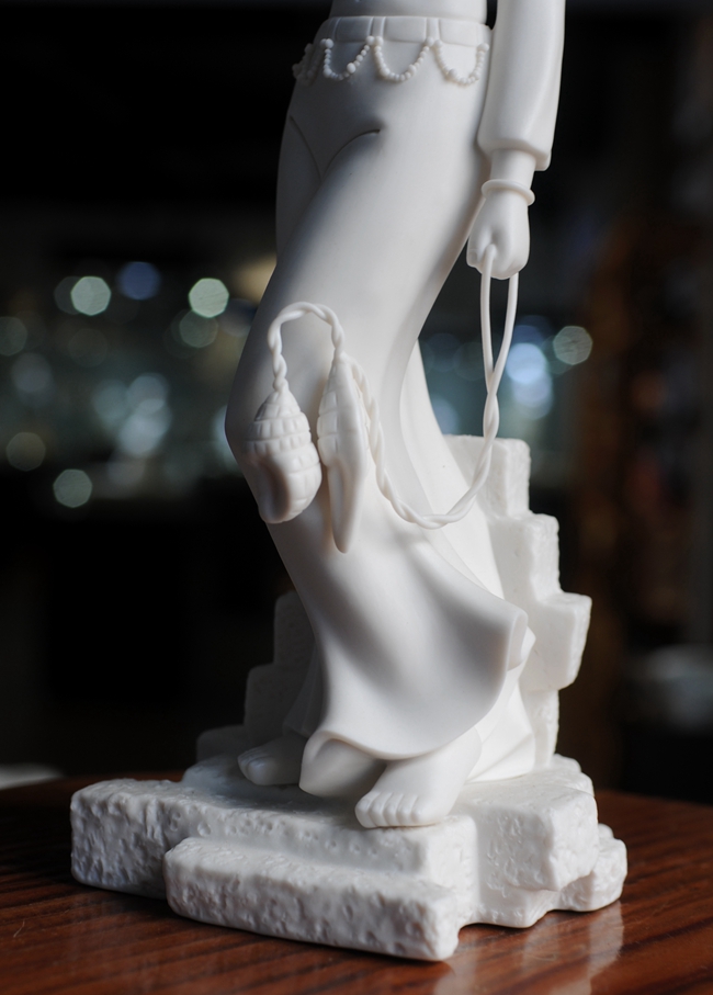 早在明代德化白瓷就名聲在外,一代“瓷圣”何朝宗名作流傳后世,成為世界各大博物館收藏的珍品,更對雕塑史上產(chǎn)生深遠(yuǎn)的影響,形成“何派”雕塑,其開創(chuàng)的捏、塑、雕、刻、刮、削、接、貼八字技法延用至今。何派雕塑注重于細(xì)節(jié)之美,精益求精,故而十分著意衣紋的刻畫,使線條流暢,翻轉(zhuǎn)自然。觀其作品仿佛有春風(fēng)拂面,衣袂飄揚的出塵之感。