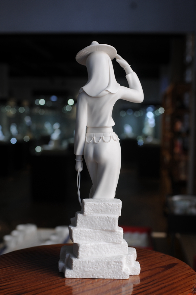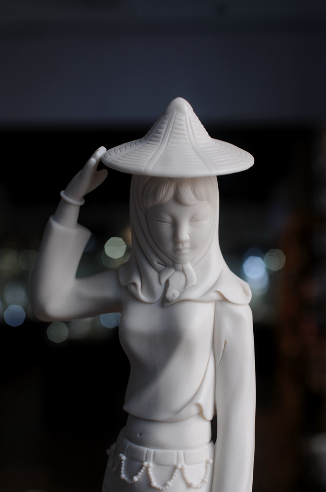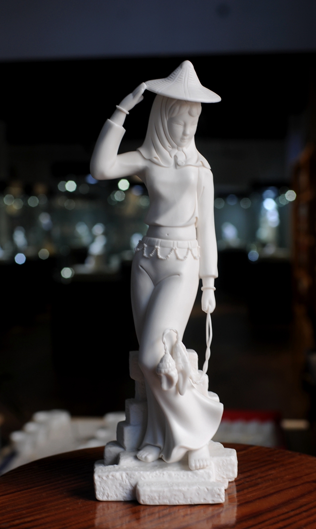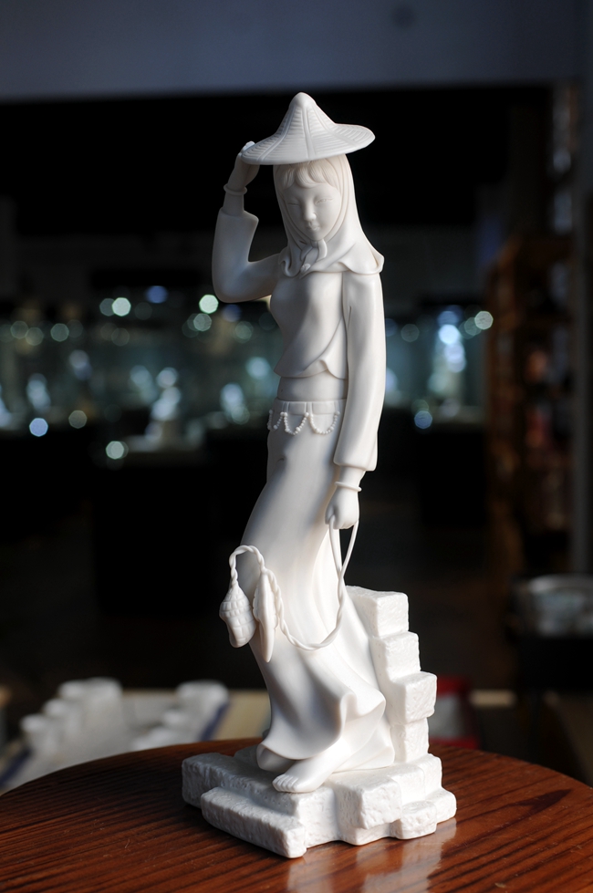 《趕!酚晒に噹熢O(shè)計創(chuàng)作。作品以德化溫潤如玉的德化白瓷為胎質(zhì),經(jīng)1300多度高溫?zé),胎體溫潤如玉,胎體通透,溫潤如玉,瓷感細(xì)膩。作品以寫實雕塑手法,見一民間風(fēng)情女子,頭帶斗笠,頭巾捂住雙頰下頜,上身穿短狹斜襟衫,露出肚臍,下穿寬大黑褲,抬腳盤坐石子,獨具風(fēng)采。作品純手工雕刻,細(xì)致刻畫,所到之處無不精細(xì)贊嘆,足見大師在創(chuàng)作時的獨運匠心,作品有大師印章落款,兼具審美價值和收藏價值,是一件不可多得的收藏精品。是辦公、家居、書房裝飾擺設(shè)、禮贈、收藏的好選擇。