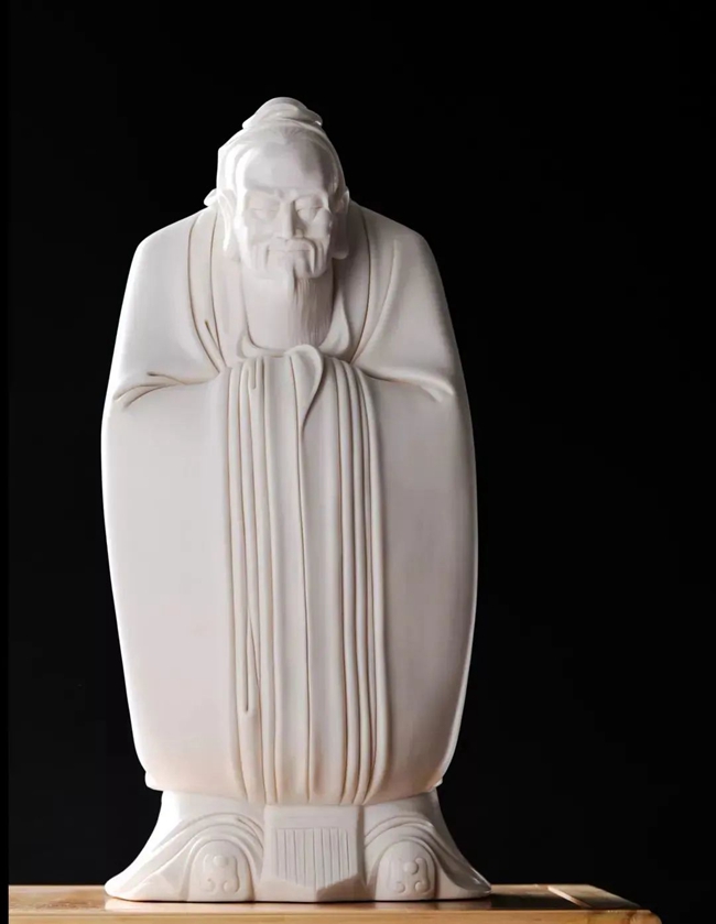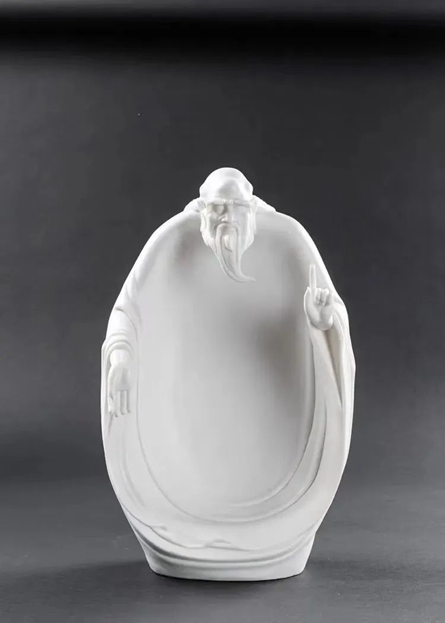 老子便是道家思想的集大成者,在瓷雕傳統(tǒng)造像中,通常是通過(guò)老子的動(dòng)作形態(tài)、面部表情來(lái)展現(xiàn)老子肆意灑脫的道家精髓。而在作品《道法自然》中,陳建陽(yáng)幾乎完全拋棄了傳統(tǒng)人物造像習(xí)慣,對(duì)老子進(jìn)行大膽的變形,除頭部及雙手外完全看不出人體特征,整體造型呈瓢狀,胸膛向內(nèi)深陷,仿佛要融于天地之間,又像是要包容世間萬(wàn)物,一手懸于空中伸出食指向上指天,一手掌心朝外手指下垂示意大地,象征著回歸真我,不執(zhí)于物,面部神態(tài)恬淡自如,似乎以最平淡、天真的心態(tài)面對(duì)囂雜的塵世,傳達(dá)一種脫塵出俗、仙風(fēng)道骨、遨游“無(wú)為”之境的道家氣韻。