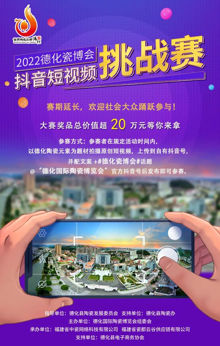 經(jīng)德化瓷博會(huì)組委會(huì)研究,決定將原定于2022年11月3日至5日在德化會(huì)展中心舉辦的2022德化國(guó)際陶瓷博覽會(huì)(以下簡(jiǎn)稱“德化瓷博會(huì)”)延期,配套活動(dòng)“2022德化瓷博會(huì)抖音短視頻挑戰(zhàn)賽”比賽時(shí)間也將繼續(xù)延長(zhǎng),創(chuàng)作時(shí)間更充裕,主辦方在此誠(chéng)邀社會(huì)各界人士積極參與,助力打響“德化瓷博會(huì)”名片,不斷提升瓷都德化的社會(huì)影響力。