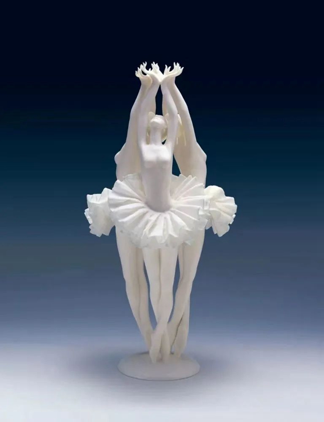 走進(jìn)瓷藝城大師館,映入眼簾的便是中國工藝美術(shù)大師許興泰的白瓷作品《觀音頭像》,觀音頭梳發(fā)髻,經(jīng)過許興泰打磨的秀發(fā)紋理分明,細(xì)膩溫潤。另一處展柜呈現(xiàn)的《天鵝湖》由柯宏榮、陳桂玉共同創(chuàng)造,三位芭蕾少女踮起腳尖、高舉雙手,在渺渺樂曲中一展舞姿。邱雙炯制作的仕女持扇輕笑、神態(tài)嬌柔,她身著綾羅,瓷土燒制的裙擺皺褶如水波粼粼,仿佛當(dāng)真由綢緞編織而成……諸位大師作品齊聚一堂,無聲交談中,盡顯德化陶瓷美學(xué)魅力。