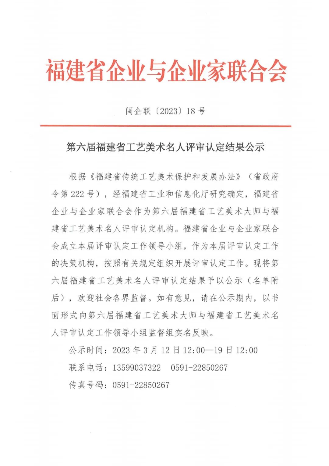 第六屆福建省工藝美術(shù)名人評審認(rèn)定結(jié)果公示