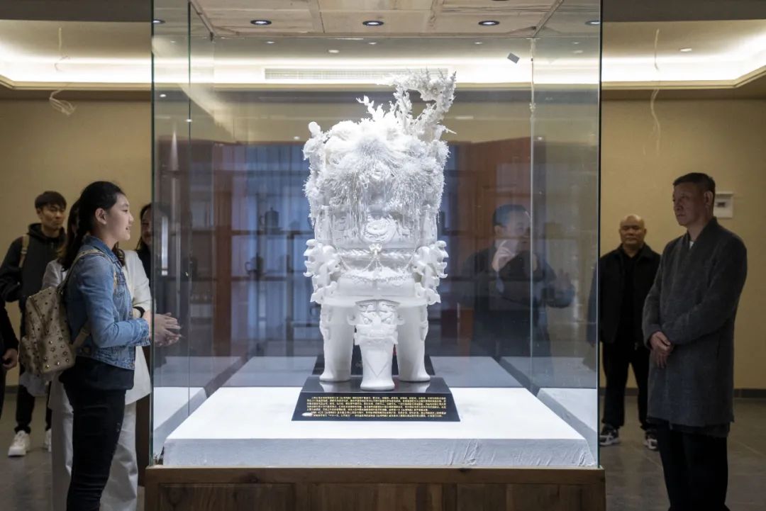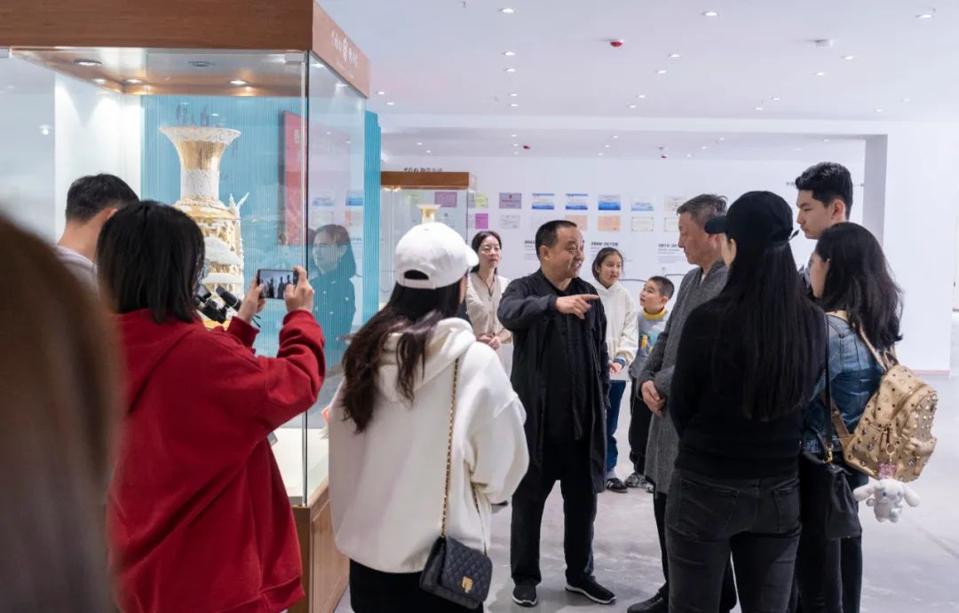 韓磊老師一行邊看邊聽,都為中國白陳仁海團(tuán)隊所創(chuàng)作的一件件匠心之作贊嘆不已,在價值5.6億元、上海世博會鎮(zhèn)館之寶《世博和鼎》前,客人們贊嘆道:“30個人制作了3年,才碰巧燒出這一件呀,真難得!真不愧是‘千年一寶、世界瓷王’!”他們紛紛拿起手機(jī)拍照留念。