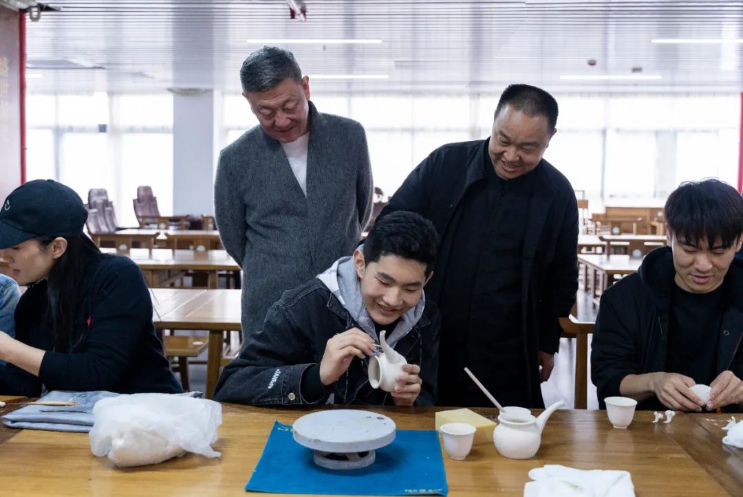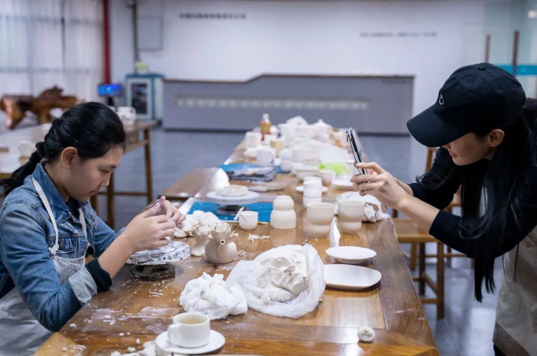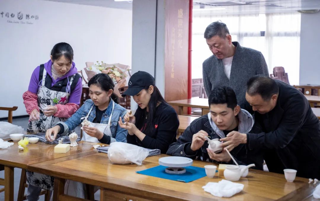 如此精美的“中國白”是怎樣制作出來的呢?參訪過程中,韓磊老師一行還興致勃勃的玩起了泥巴,參與到非遺傳承項(xiàng)目“中國白”陶瓷技藝的創(chuàng)作當(dāng)中,現(xiàn)場歡聲笑語,其樂融融。