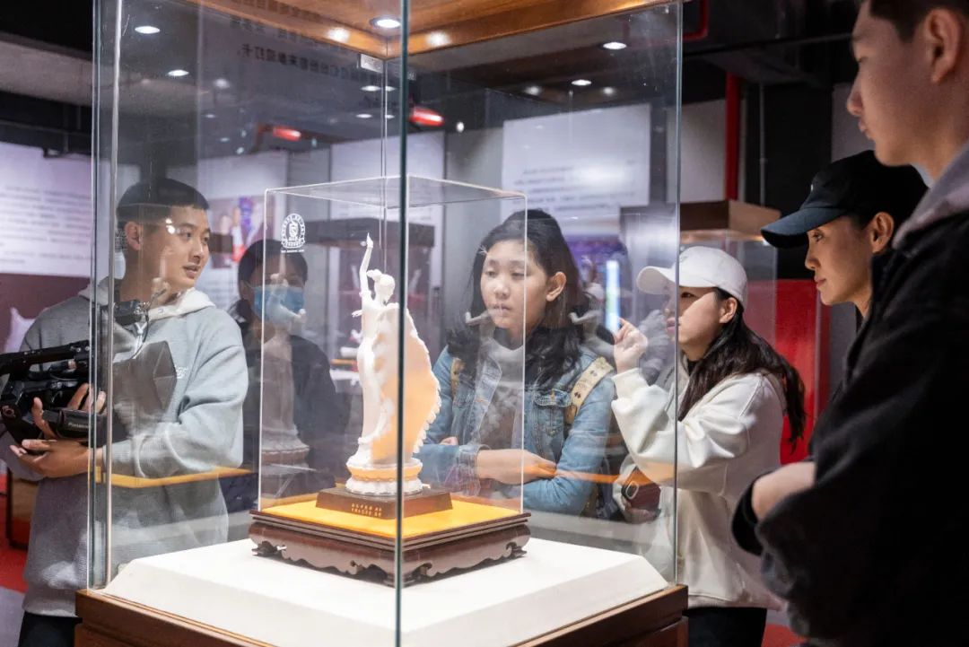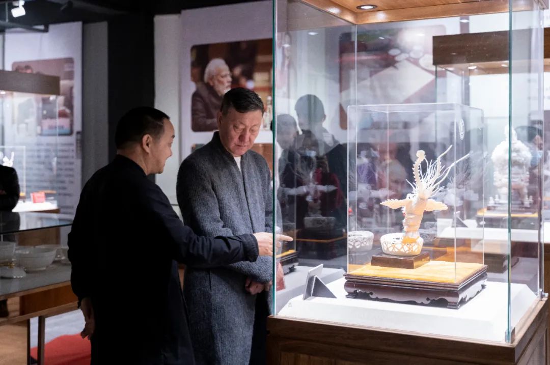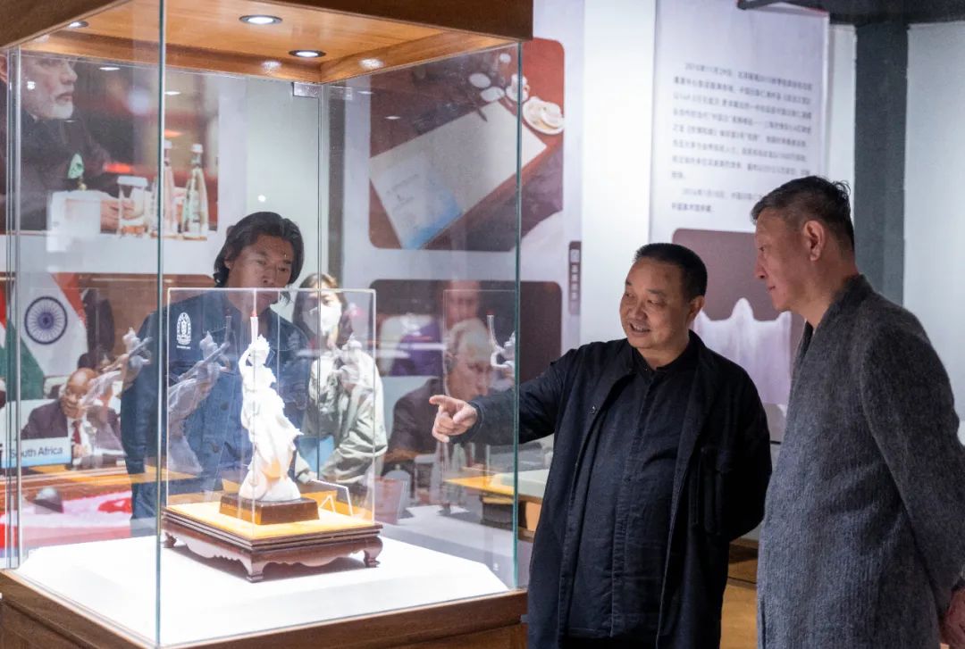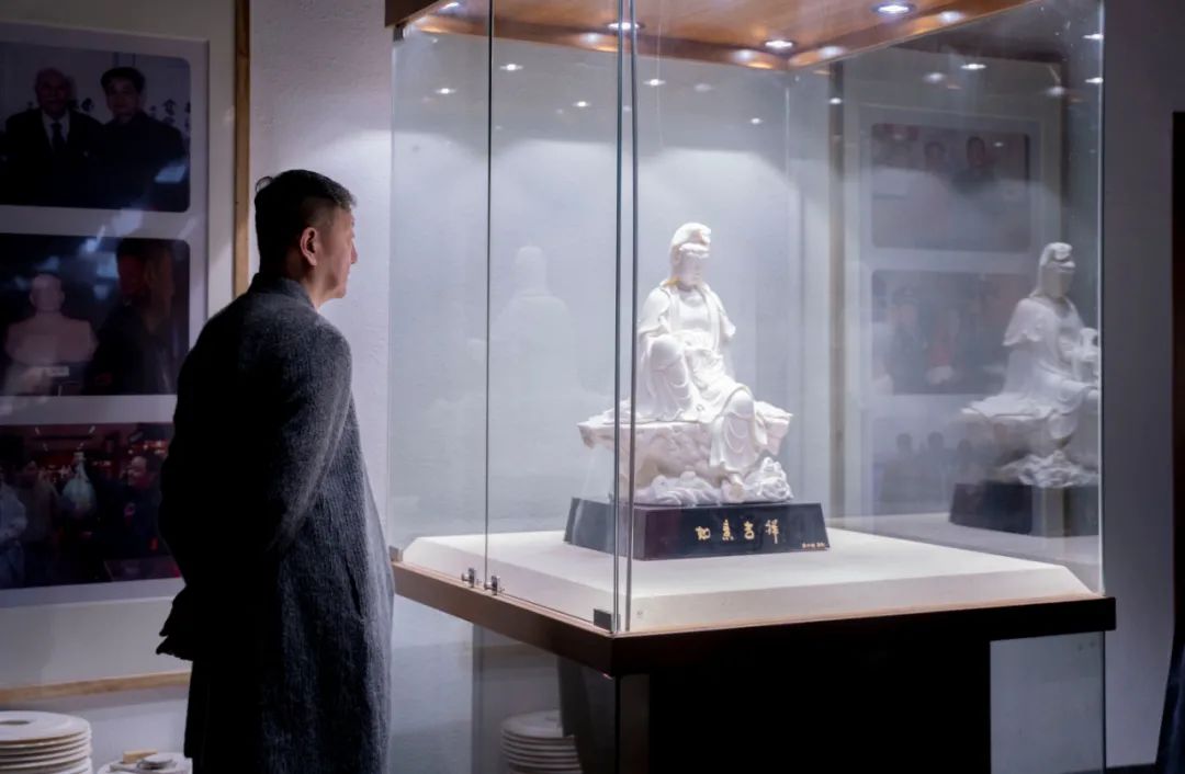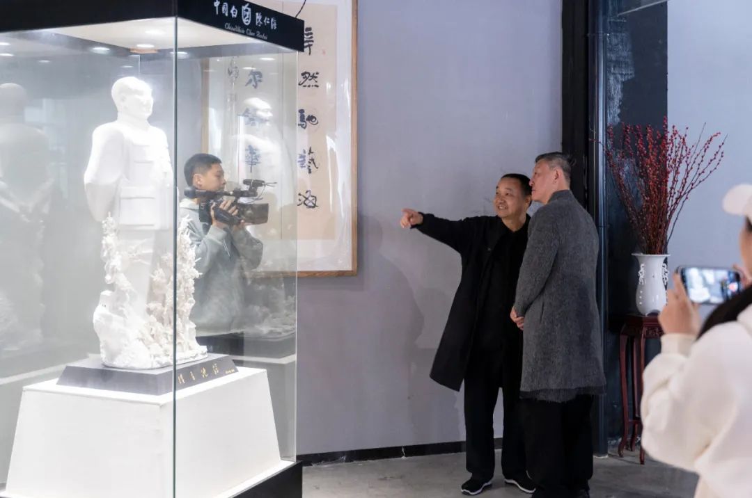 隨后,韓磊老師一行饒有興致的鑒賞了中國白陳仁海團(tuán)隊創(chuàng)作的《紫歸牡懷》《閩龍出!贰墩l主沉浮》《夢回大唐》《點(diǎn)亮世界》《開拓輝煌》等一系列見證國家發(fā)展歷程,貼近時代、貼近生活、貼近群眾,富有時代特征的瓷雕藝術(shù)作品,近距離感受中國白陳仁海團(tuán)隊堅持“中國白”文化自信,三十年只做一件事——復(fù)興中國白,引領(lǐng)“中國白”文化走向世界的創(chuàng)作初心以及中國白陳仁海團(tuán)隊與國家同命運(yùn)共呼吸、融史于瓷、精雕細(xì)琢、精益求精的創(chuàng)作匠心。