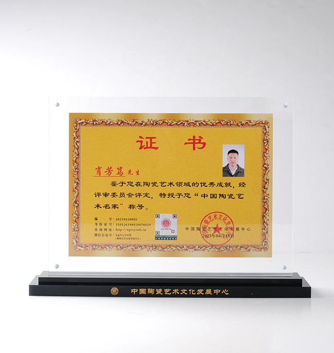 肖芳篤出生于“世界瓷都德化”,從小耳濡目染,便喜歡上陶瓷這門藝術,2013年開始學習陶瓷制作,肖芳篤深入大師工作室,從點點滴滴學起。經(jīng)過近10年的拜師學藝,熟練掌握制瓷各個工序,如瓷泥加工、手拉胚、塑樣、燒制等無不樣樣精通。先后深入宜興等地學習交流制壺技藝。2021年成立德化瀚篤陶瓷有限公司,經(jīng)過多年積累,創(chuàng)作出一系優(yōu)秀茶器作品,主要作品有冰種玉瓷茶具套裝、主人杯、瓷壺、手繪茶器等,所創(chuàng)作品造型優(yōu)美、瓷質溫潤如玉,作品曾多次獲各評比金獎,2022年《招財納!窐s獲北京陶瓷藝術名家作品展金獎,2023年《人生雅事》、《精雕禪定杯》榮獲北京陶瓷藝術名家作品展金獎,作品廣受客商、收藏愛好者喜愛。