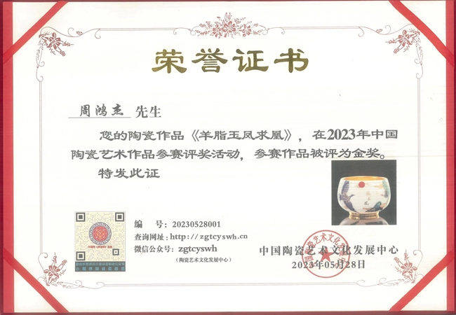 近日中國(guó)陶瓷藝術(shù)非遺傳承人、中國(guó)當(dāng)代工藝美術(shù)大師、高級(jí)工藝美術(shù)大師周鴻杰老師作品《羊脂玉鳳求凰》、《羊脂玉金絲龍鳳對(duì)杯》榮獲2023年北京陶瓷藝術(shù)名家作品展金獎(jiǎng)。