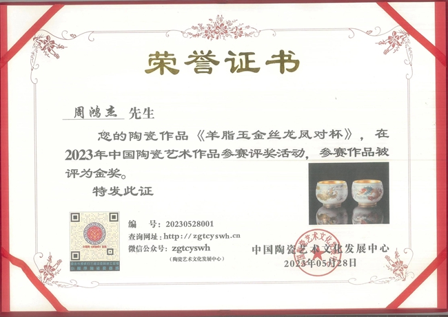 《羊脂玉金絲龍鳳對(duì)杯》榮獲2023年北京陶瓷藝術(shù)名家作品展金獎(jiǎng)。