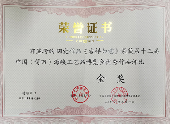 2018年05月《吉祥如意》榮獲第十三屆中國(莆田)海峽工藝品博覽 會(huì)優(yōu)秀作品評比金獎(jiǎng);