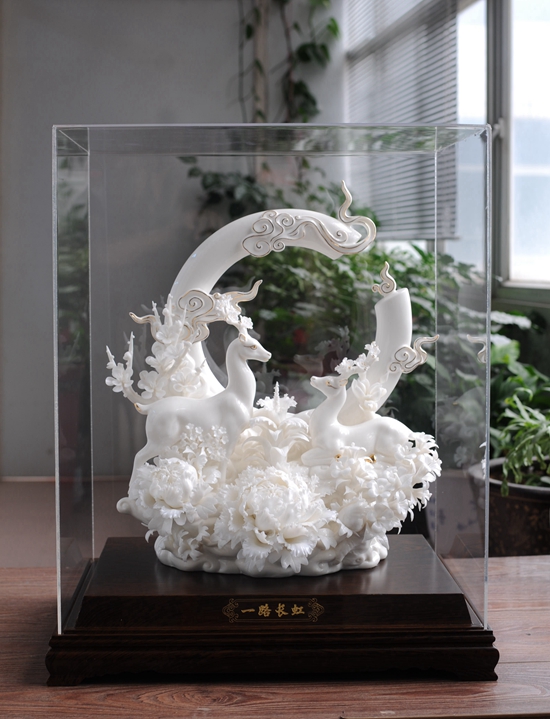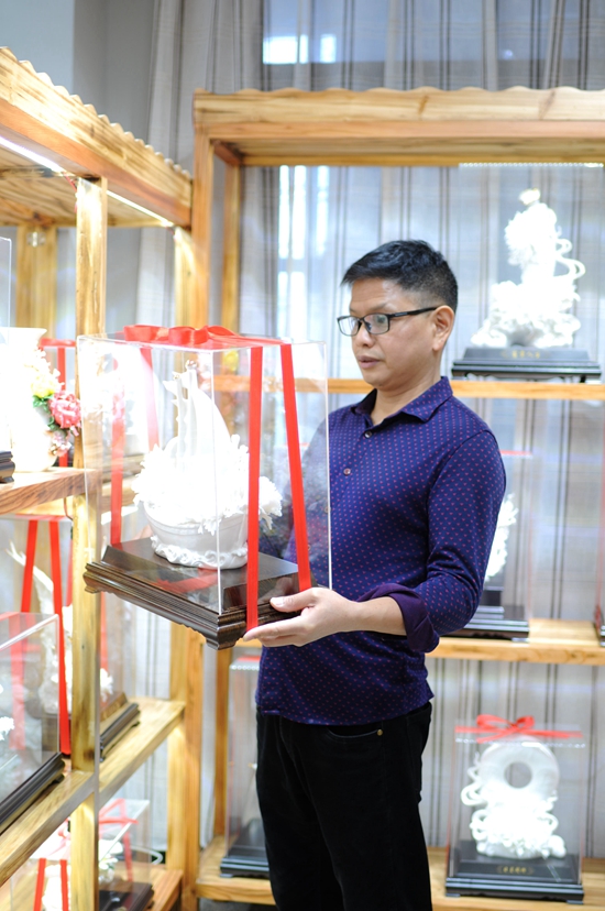 郭顯跨從小深受陶瓷文化熏陶,完成學(xué)業(yè)后開始專注陶瓷雕塑創(chuàng)作,經(jīng)過20多年的學(xué)習(xí)與積累,其精通制瓷各工序,熟練掌握雕塑、捏花、制釉、燒制等技藝。所創(chuàng)作品精選優(yōu)質(zhì)瓷泥,用心配制,以1300多度高溫?zé)贫桑商ゼ?xì)膩堅(jiān)致,色溫潤如玉,剔透光滑,猶如雪白霜凝,釉面光滑,擊聲如磐。