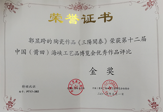 2017年07月《三陽開泰》榮獲第十二屆中國(莆田)海峽工藝品博覽 會(huì)優(yōu)秀作品評比金獎(jiǎng);