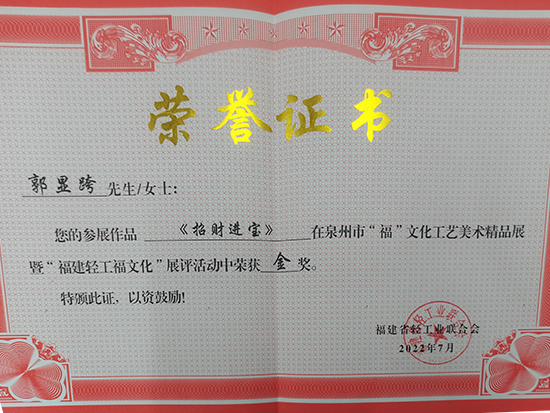 2022年07月《招財(cái)進(jìn)寶》榮獲泉州市“福”文化工藝美術(shù)精品展暨“ 福建輕工福文化”展金獎(jiǎng);