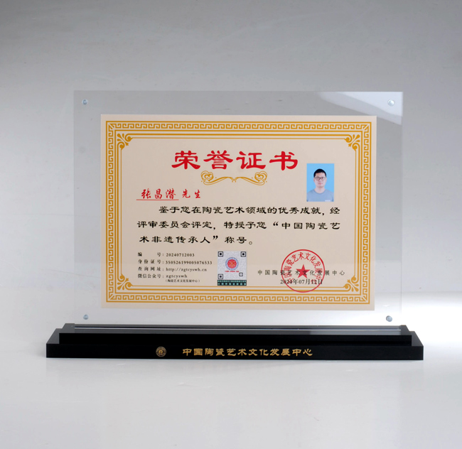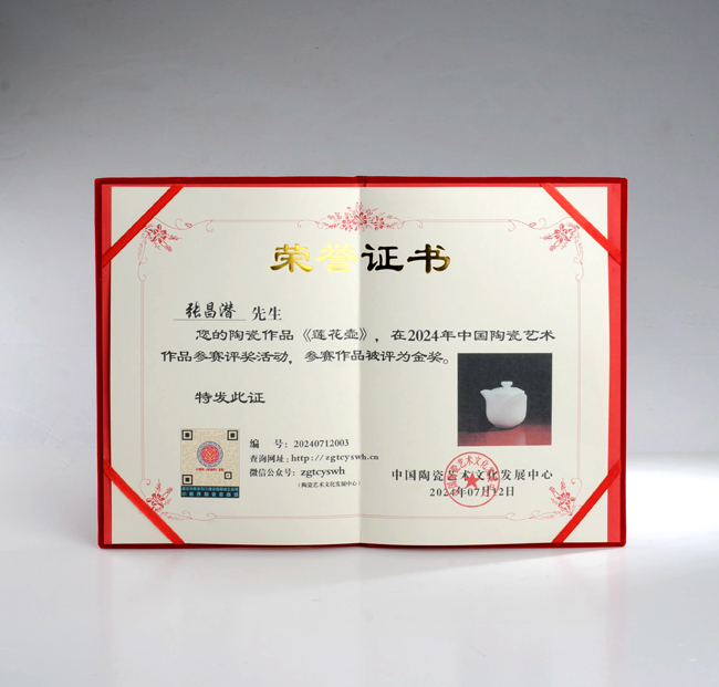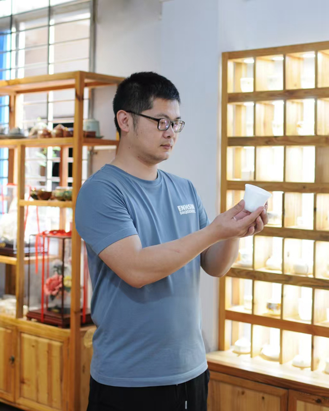 張昌潛出生于“世界瓷都德化”,從小耳濡目染,喜歡上陶瓷這門藝術,2013年開始學習陶瓷制作,先后深入大師工作室,從點點滴滴學起。經過近10年的積累,熟練掌握制瓷各個工序,如瓷泥加工、手拉胚、塑樣、燒制等。先后到宜興等地學習交流制壺技藝。2017年創(chuàng)辦見友臻品,經過多年積累,創(chuàng)作出一系列優(yōu)秀茶器作品,主要作品有羊脂玉瓷、冰種玉瓷茶具套裝、主人杯、瓷壺等,所創(chuàng)作品造型優(yōu)美、瓷質溫潤如玉,作品曾多次獲各評比金獎,2024年榮獲中國陶瓷藝術非遺傳承人,作品廣受客商、收藏愛好者喜愛。
