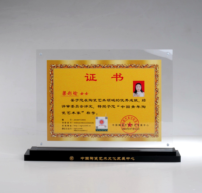 梁彩瑜出生在世界瓷都德化,從小深受陶瓷文化熏陶,也喜歡上了陶瓷技藝。畢業(yè)后便開發(fā)始從事陶瓷創(chuàng)作,經(jīng)過10多年學(xué)習(xí)與工作積累,熟練掌握泥料選配、器型設(shè)計、手拉坯、釉水配方、燒制技藝等。其積極探索與大膽創(chuàng)新,創(chuàng)作出一系列優(yōu)秀作品,主要作品有茶器、圍爐煮茶、工藝擺件等,作品器形豐富,款式新穎,深受廣大客戶喜愛,多件作品被評為金獎,2024年被評為中國青年陶瓷藝術(shù)家。