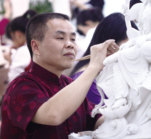 鄭雄文,山花陶瓷創(chuàng)始人、山花陶瓷黨支部書記、高級(jí)工藝美術(shù)大師、福建省陶瓷藝術(shù)大師,福建省陶瓷藝術(shù)專業(yè)委員會(huì)委員。1967年生于德化陶瓷世家,1984年創(chuàng)辦山花陶瓷。二十余年來,遍訪名山古剎,拜謁高僧大德,結(jié)佛緣、悟禪理,以虔誠(chéng)的信仰鑄就靜心的藝術(shù)。麾下有百余名藝術(shù)精湛的瓷雕技師,不斷推出佛像、佛具、禮品等堪為傳世的經(jīng)典瑰寶。