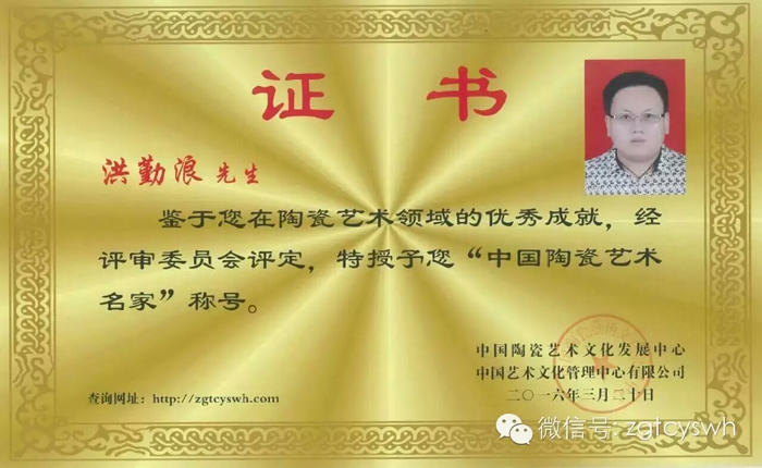 洪勤浪,藝名:布依仁,畢業(yè)于景德鎮(zhèn)陶瓷學(xué)院,江西省工藝美術(shù)家,江西省高級技師(國家一級),國家陶瓷雕刻一級工藝美術(shù)師,江西省工藝美術(shù)師,2016年獲“中國陶瓷藝術(shù)名家”稱號,景德鎮(zhèn)市昌江區(qū)政協(xié)委員,景德鎮(zhèn)非物質(zhì)文化遺產(chǎn)(代表性)雕刻傳承人,輝煌中國書畫陶瓷藝術(shù)研究院研究員,中國陶瓷藝術(shù)文化發(fā)展中心景德鎮(zhèn)分中心主任,景德鎮(zhèn)市技?妥淌,景德鎮(zhèn)市陶瓷歷史文化研究會理事,景德鎮(zhèn)民間藝術(shù)家協(xié)會會員,景德鎮(zhèn)陶瓷藝術(shù)交流中心會員。