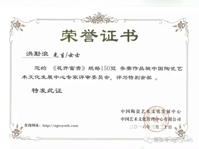 作品被江西省工藝美術(shù)館、景德鎮(zhèn)陶瓷館(國家二級博物館)收藏。2015年作品《綠地暗紋葫蘆瓶》被釣魚臺國賓館收藏。 受到李長春、劉云山、吳官正、丁關(guān)根,著名收藏家馬未都先生、中央電視CCTV-4《國寶檔案》專家唐愷、著名藝術(shù)品收藏家王剛、著名演員唐國強、著名導(dǎo)演張紀中等國家領(lǐng)導(dǎo)人和名人的好評與珍藏。