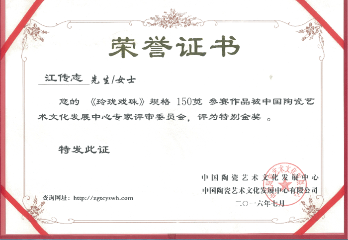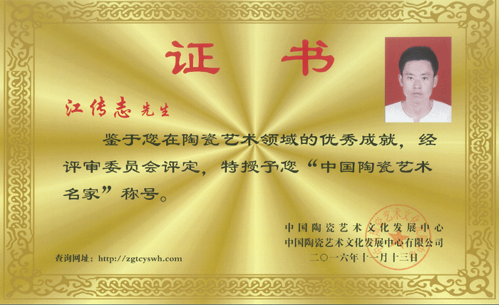 2016年經(jīng)中國陶瓷藝術文化發(fā)展中心評審委員會評定為“中國陶瓷藝術名家”。