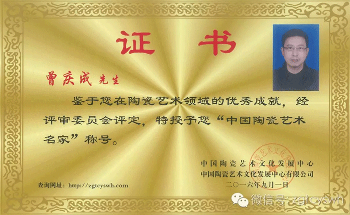 2016年8月經(jīng)中國陶瓷藝術(shù)文化發(fā)展中心評審委員會評定為“中國陶瓷藝術(shù)名家”。