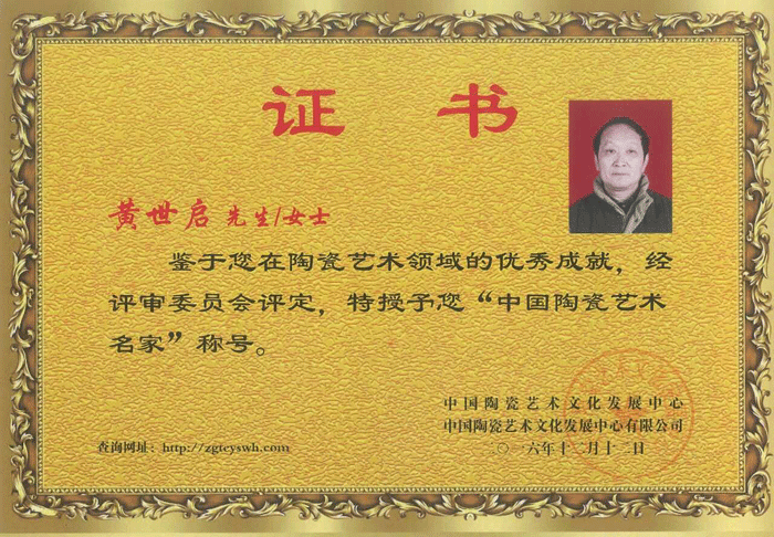 黃世啟:字“啟人”,1953年出生于景德鎮(zhèn)雕塑陶瓷世家,陶瓷綜合堆雕非物質(zhì)文化遺產(chǎn)傳承人,文化部國家級工藝美術(shù)大師,國家一級技師,江西省級技能大師,江西省高級工藝美術(shù)師,江西省高級陶瓷美術(shù)師,江西書畫院副院長,中國書畫藝術(shù)交流協(xié)會會員,昌南書畫院副秘書長,景德鎮(zhèn)博匯陶瓷文化藝術(shù)交流中心藝術(shù)總監(jiān),景德鎮(zhèn)天玉瓷廠廠長。 自幼愛好陶瓷藝術(shù),1987年至1993年在雕塑瓷廠美研室從事美術(shù)設(shè)計工作,系中函藝聯(lián)理事,昌南書畫院副秘書長,昌南書畫院畫師,為弘揚陶瓷文化,現(xiàn)創(chuàng)辦天玉瓷廠任廠長。景德鎮(zhèn)御窯世家傳人,自幼受家庭熏陶,在高溫顏色釉陶瓷方面,繼承和弘揚了前輩們的陶瓷藝術(shù)精髓,特別是在顏色釉燒制過程中的窯變研制有較突出的創(chuàng)新和造詣!