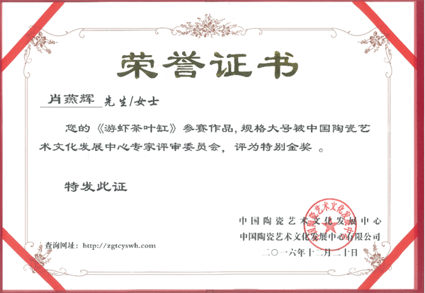2016年作品《大號(hào)茶葉缸》經(jīng)中國陶瓷藝術(shù)文化發(fā)展中心評(píng)審委員會(huì)評(píng)定為“特別金獎(jiǎng)”。