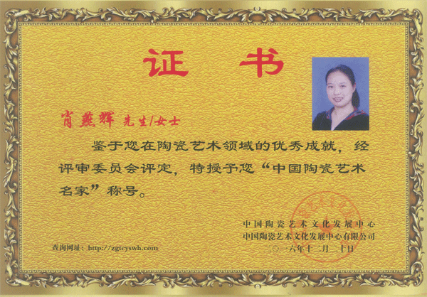 2016年被中國陶瓷藝術(shù)文化發(fā)展中心評(píng)審委員會(huì)授予“中國陶瓷藝術(shù)名家”榮譽(yù)稱號(hào)。