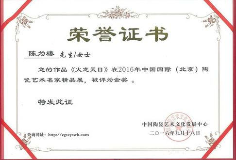 "作品《火龍?zhí)炷俊飞暾?qǐng)參加第二屆北京中國(國際)陶瓷藝術(shù)名家作品展評(píng)比“金獎(jiǎng)”。