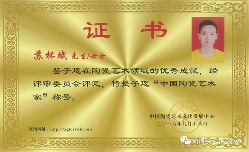 2016年經(jīng)中國陶瓷藝術(shù)文化發(fā)展中心評審委員會評定為“中國陶瓷藝術(shù)家".