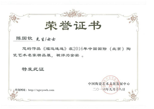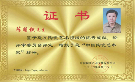 2016年經(jīng)中國(guó)陶瓷藝術(shù)文化發(fā)展中心評(píng)審委員會(huì)評(píng)定為“中國(guó)陶瓷藝術(shù)家”。