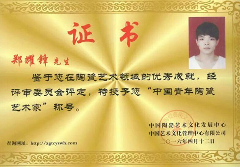 2016年經(jīng)中國陶瓷藝術(shù)文化發(fā)展中心評審委員會評定為“中國青年陶瓷藝術(shù)家”。;