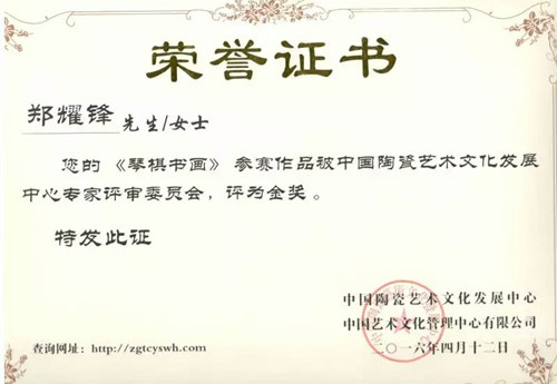 作品《琴棋書畫》2016年榮獲中國陶瓷藝術(shù)文化發(fā)展中心評審委員會評定為金獎