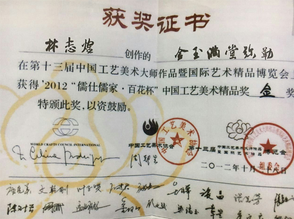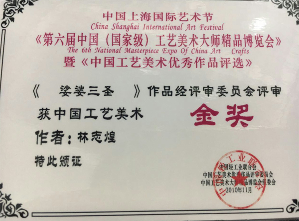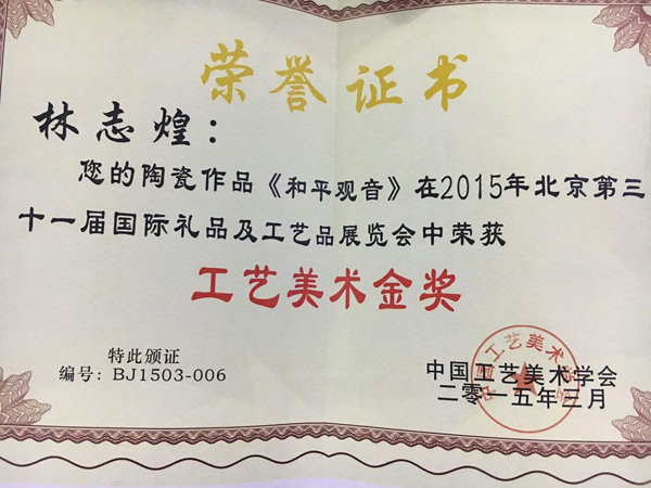 2008年創(chuàng)作的"百花藍(lán)"榮獲首屆中國(guó)陶瓷藝術(shù)精品收藏博覽會(huì)金獎(jiǎng)。 2010年創(chuàng)作的"娑婆三圣"榮獲中國(guó)上海國(guó)際藝術(shù)節(jié)金獎(jiǎng)。 2012年創(chuàng)作的"金玉滿堂彌勒"榮獲第十三屆中國(guó)工藝美術(shù)大師作品暨國(guó)際藝術(shù)精品博覽會(huì)百花杯金獎(jiǎng)。 2013年創(chuàng)作的"和平觀音"榮獲第十五屆中國(guó)工藝美術(shù)精品博覽會(huì)金獎(jiǎng)。 2015年作品巜和平觀音》榮獲北京第十一屆國(guó)際禮品工藝品展覽會(huì)金獎(jiǎng)。