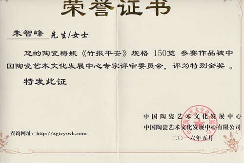79年中央美院專(zhuān)業(yè)深造。著名書(shū)畫(huà)家林散之學(xué)生,F(xiàn)為中國(guó)工藝研究院理事!吨袊(guó)工藝美術(shù)大師》榮譽(yù)稱(chēng)號(hào)。1990年朱智峰老師被中法文化交流協(xié)會(huì),歐中文化藝術(shù)促進(jìn)會(huì)會(huì)長(zhǎng)莎芳莉和法國(guó)巴黎第一市長(zhǎng)授權(quán)“歐中書(shū)畫(huà)家,藝術(shù)家”榮譽(yù)稱(chēng)號(hào),并被聘為中國(guó)工藝美術(shù)大師特邀代表。朱智峰老師的藝術(shù)創(chuàng)意作品,在海內(nèi)外向有一定的知名度。