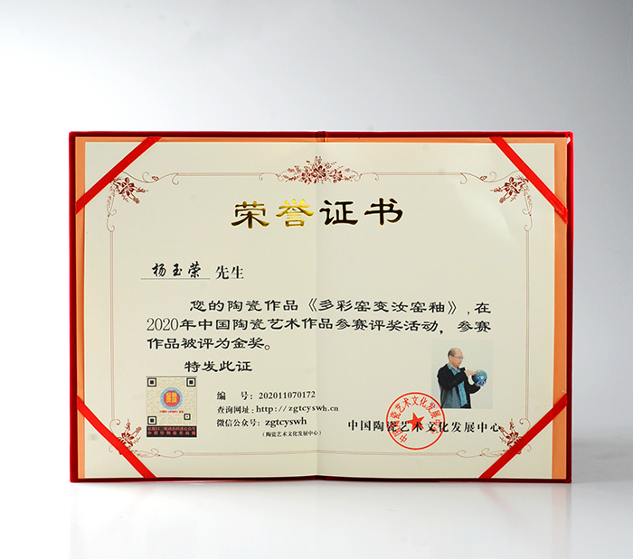 《多彩窯變?nèi)旮G釉》榮獲金獎(jiǎng) 楊玉榮——高級(jí)工藝美術(shù)師 楊玉榮——中國當(dāng)代工藝美術(shù)大師 中國當(dāng)代工藝美術(shù)大師榮譽(yù)證書