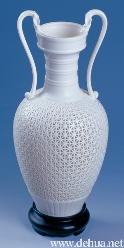 《雙龍爭(zhēng)艷通花瓶》,創(chuàng)作于2002年,榮獲2002年福建省工藝美術(shù)精品“爭(zhēng)艷杯”大賽銅獎(jiǎng)、中國(guó)工藝美術(shù)“2002華藝杯”銅獎(jiǎng);
