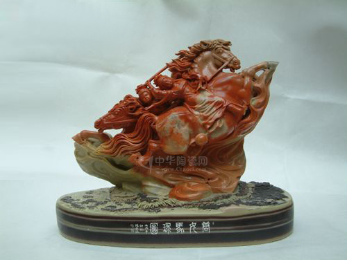 這件作品是迎奧運(yùn)而雕刻的 “唐女馬球圖”。唐代長(zhǎng)安城內(nèi)的馬球運(yùn)動(dòng)曾風(fēng)靡一時(shí),還有皇家專門的馬球隊(duì)。唐玄宗就曾率領(lǐng)皇家馬球隊(duì)擊敗過來訪的波斯馬球隊(duì),這在史籍上有記載的,說明中華民族在古代就喜愛體育運(yùn)動(dòng)。作品以青田名貴封門紅花精制而成,表現(xiàn)兩個(gè)唐女騎在馬背上有相互爭(zhēng)斗呼應(yīng)的場(chǎng)面。兩人兩騎,一繁一簡(jiǎn),一主一從,虛實(shí)輕重,馬的剛猛,仕女的柔美,一剛一柔形成對(duì)比強(qiáng)烈的生機(jī)和意趣。
