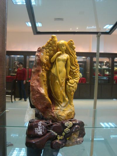 《花影妖嬈》采用封門紅花精雕而成,取黃色為人為花,背景保持原石原貌,以突出主題。作品中人物與花卉相映成輝,相互穿插,著刀處抓形見神,不著刀處留以更多的遐想。