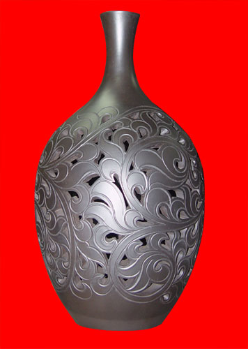 造型奇特,小口,長頸,下部漸豐,腹部豐滿平底。給人以活潑而沉穩(wěn)的感覺。充分展示了鏤空工藝。整體刻以唐草圖案錯落有致,連綿不斷,由卷而舒。給人無限美感。口小肚大,易進難出,具有避邪藏寶,聚集人氣,財氣運氣之功.