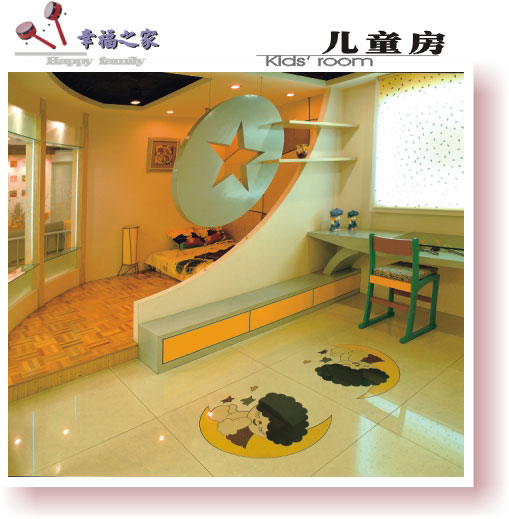 | 睡眠區(qū)以太白星、瑰麗星、太陽石等三種拋光磚呈拋物線形態(tài)自由構(gòu)成,充滿了審美情趣與創(chuàng)造力。賦予冰冷的拋光磚豐富的內(nèi)蘊及熱情,并成功地融入生動活潑的兒童房中。活動區(qū)則以潔凈的太白星做大面積的鋪貼,易于清潔、打理。 |