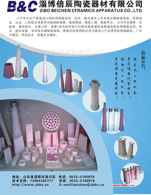 我公司(ZIBO BEICHEN CERAMICS APPARAYUS CO.,LTD)專(zhuān)業(yè)生產(chǎn)、 專(zhuān)業(yè)維修高速紙機(jī)用陶瓷成形板、陶瓷刮水板、陶瓷脫水板、毛布吸水箱面板, 專(zhuān)業(yè)生產(chǎn)、改造全陶瓷造紙用高低濃陶瓷除渣器。 維修高速紙機(jī)用陶瓷刮水.成型.脫水板長(zhǎng)度在12米寬度1米的任意幾何面任意角度的補(bǔ).磨.拋光修理. 維修后經(jīng)使用驗(yàn)證與原進(jìn)口產(chǎn)品使用效果相媲美。 經(jīng)過(guò)倍辰技術(shù)人員的不斷公關(guān),在造紙用陶瓷領(lǐng)域取得顯著成績(jī),并特為造紙制漿廠(chǎng)生產(chǎn)了剛玉陶瓷耐磨、耐高溫 耐腐蝕、耐高壓管道,陶瓷三通、陶瓷彎頭、陶瓷風(fēng)機(jī)扇葉襯片,離心機(jī),氧化鋯,剛玉耐磨陶瓷配件。 廣告可模仿,倍辰技術(shù)質(zhì)量無(wú)法模仿。 倍辰宗旨:給自己一次機(jī)會(huì),享受倍辰誠(chéng)摯服務(wù);給我們一次機(jī)會(huì),展示倍辰完美技術(shù)。 Our company (ZIBO BEICHEN CERAMICS APPARAYUS CO., LTD) the specialized production, the specialized service high speed paper machine with the ceramic forming board, the ceramics blow Shui Ban, the ceramic dehydration board, Mao Buxi the water tank kneading board, the specialized production, transforms the entire ceramic papermaking to use the height thick ceramics skim gate. Services the high speed paper machine to blow the water with the ceramics. Formation. Dehydrated board length in 12 meter width 1 meter random geometry surface random angle making up. Rubbing. Polishing repair. After the service compares favorably with after the use confirmation and the original import product use effect. After the time of chen technical personnel's unceasing public relations, obtain the remarkable result in the papermaking with the ceramic domain, and the papermaking system thick liquid factory produced the corundum ceramics specially wear-resisting, thermostable anti-corrosive, has borne the high-pressured pipeline, the ceramic Three Contacts, the ceramic bend, the ceramic air blower fan blade burr, the centrifuge, the zirconium oxide, the corundum wear-resisting ceramics fitting. The advertisement may imitate, time of chen technical quality is unable to imitate. Time of bei chen objective: For oneself an opportunity, enjoys time of chen sincere service; For us an opportunity, demonstration time of chen perfect technology. |