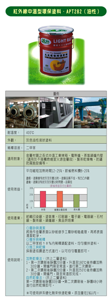 適用溫度:450℃以下 適用對象:金屬材質(zhì)之商業(yè)用烤箱、開飲機內(nèi)膽、電熱爐、烘培設備、汽車底盤、引擎室等 噴涂位置:對象設備內(nèi)外壁 功能訴求:遠紅外線輻射加熱--節(jié)能、省時、提升生產(chǎn)質(zhì)量與產(chǎn)能  效 益:防銹蝕、耐刮磨、防沾黏污垢 組織成分:硅酸鹽膠變性樹脂+奈米遠紅外線素材