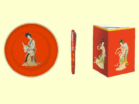 中國(guó)紅八寸盤(pán)/鋼筆/方型筆筒套裝