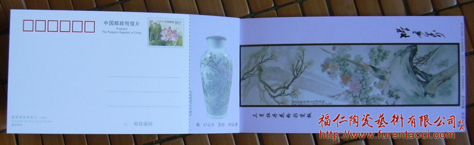 花鳥(niǎo)大王張景壽九十華誕之際,上海郵電部門(mén)經(jīng)總局批準(zhǔn)出版發(fā)行了張景壽個(gè)性化郵票和張景壽十二花季屏風(fēng)郵資明信片。明信片價(jià)格30元/套,個(gè)性化郵票價(jià)格60元/套。 歡迎各界人士電話(huà)垂詢(xún)。 上海福仁陶瓷藝術(shù)有限公司 地址:上海市斜土路461號(hào) 電話(huà):021-53022013 021-53022133 網(wǎng)址:www.furentaoci.com Email:furentaoci@sina.com |