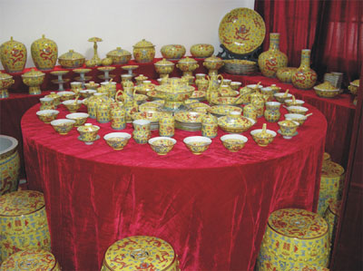 這套皇宮用瓷是按照清朝同治皇帝結(jié)婚時定制的全套皇宮用瓷,由景德鎮(zhèn)藝術(shù)瓷廠仿制,當(dāng)時共制作了兩套,一套被泰國皇室(陸軍司令)重金購去,目前國內(nèi)僅此一套。 為了仿制這套皇宮用瓷,景德鎮(zhèn)藝術(shù)瓷廠曾派數(shù)批技術(shù)人員專門到故宮查資料定品種、定規(guī)格、定瓷用顏料、定材質(zhì)等,先后三個多月 ,回廠后,由3000多名藝術(shù)和科技人員經(jīng)過三年多時間的共同努力,終于仿制成功 |