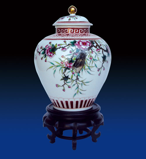 將軍罐,因其造型飽滿,氣魄雄偉酷似一位頭頂纓盔的將軍而得名,將軍罐是從明代嘉靖、萬歷年間開始生產(chǎn)到清代康熙年間官窯民窯大量燒制,將軍罐也由使用器皿逐漸發(fā)展為陳設(shè)裝飾和辟邪的藝術(shù)品。 粉彩腰纏萬貫將軍罐,器形美觀大方。在器皿的半中腰繪一只栩栩如生的蟬,故名叫腰纏萬貫,紅花寓意蘊(yùn)含紅顏知己。本藝術(shù)品畫工精細(xì),富麗堂皇,深受許多陶瓷愛好者青睞。 |